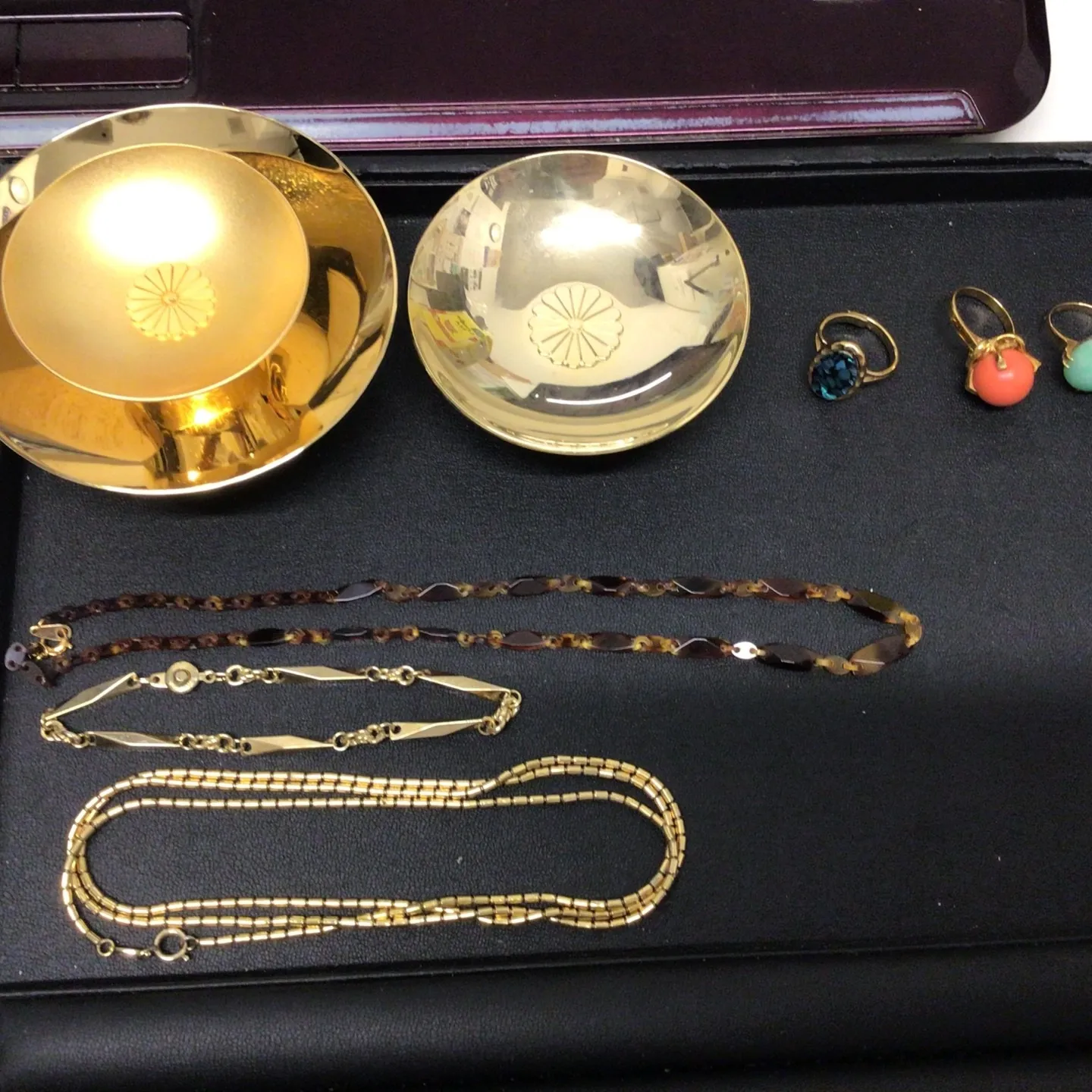 金杯は残念ながらメッキでした、銀杯は純銀です。他のお品はK18製品で間違い